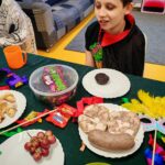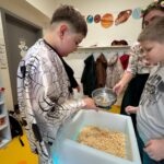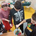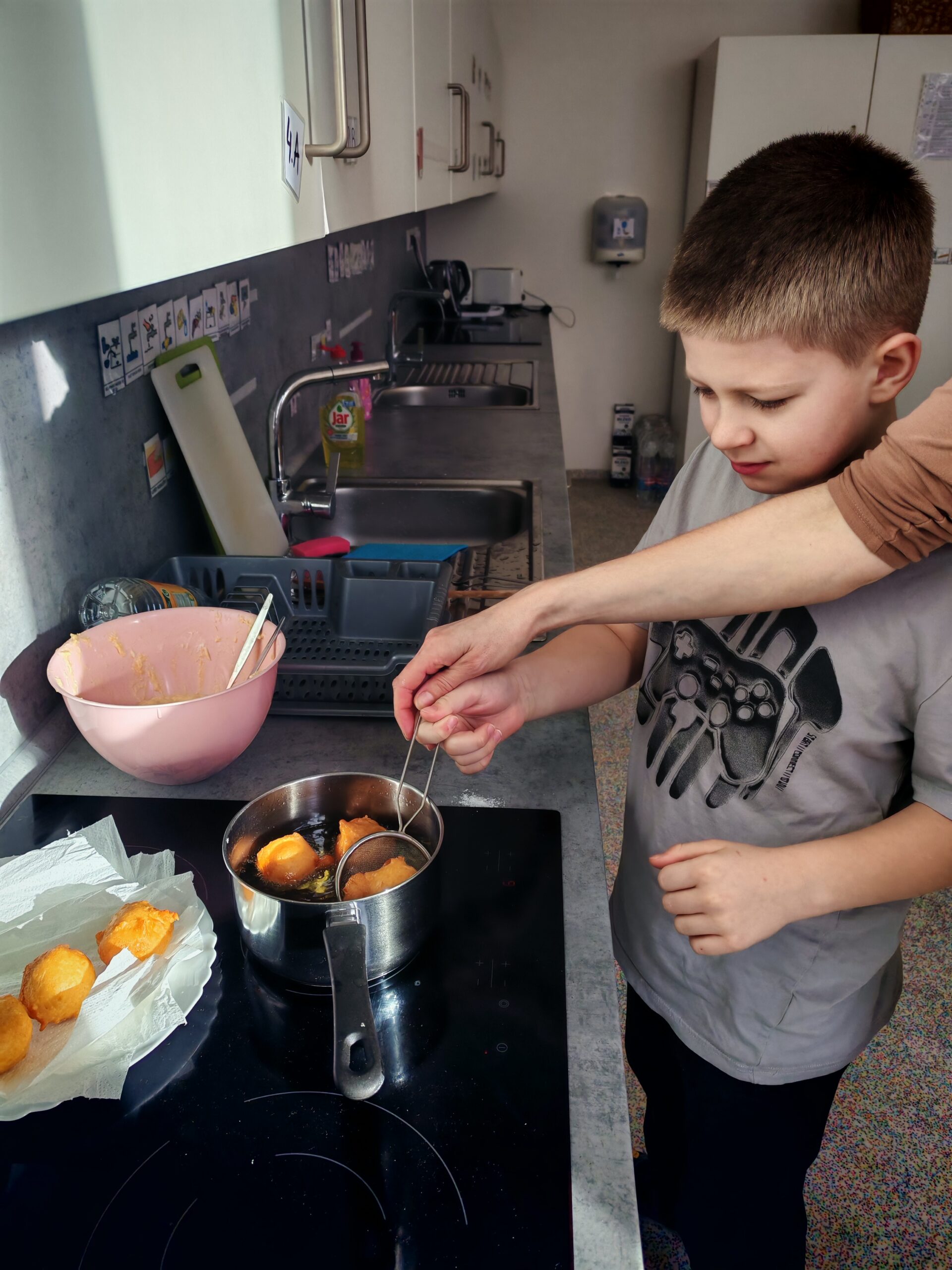 Na závěr dne se kluci vydali na masopustní obchůzku po celé škole. Za hlasitého rachotu řehtaček nabízeli ostatním vlastnoručně smažené tvarohové koblížky a šířili dobrou náladu. Celý den byl nejen veselý a plný dobrot, ale také přinesl dětem možnost poznat tradiční lidové zvyky a připomenout si, jak se masopust slavil dříve. 🎭🥨
